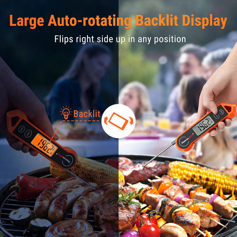 Achieve perfectly cooked meat with the ThermoPro TP19H Instant-Read Meat Thermometer. This reliable kitchen tool delivers fast and accurate temperature readings, helping you avoid overcooked steaks or undercooked poultry. Whether you're grilling burgers in the backyard, roasting turkey for a holiday dinner, or pan-searing salmon for a quick meal, the TP19H makes temperature checks simple. Its 180°auto-rotating backlit display ensures clear readings in any lighting, while the motion-sensing feature wakes the meat thermometer instantly when you pick it up. Ideal for beginners, home cooks, and BBQ enthusiasts, the TP19H is an essential tool for achieving consistent cooking results.